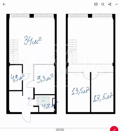 Общая площадь: 99 м² (первый уровень ~65 м², второй уровень ~34 м²)